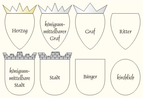 Adlige führen einen Dreicksschild, wie es sich für stolze Reiter geziemt. Die Wappen der Städten und der wenigen wappentragenden Bürgern werden dagegen auf dem halbrunden Schild der Fußsoldaten gezeigt. Die Abzeichen von Bistümern oder Abteien dagegen werden auf einem ovalen Schild dargestellt, denn sie stellen keine Soldaten. Auch das persönliche Wappen eines Bischofs oder Abts kann auf einem solchen Ovalschild gezeichnet werden, doch ist es ihm ebenfalls erlaubt, den ererbten Schild weiter zu führen. Doch nicht nur der Schild allein, auch die Kronen, die auf den oberen Rand gesetzt werden, geben Auskunft über den Rang einer Person. Herzöge führen eine goldene Krone mit fünf Zacken. Eine silberne Krone mit fünf Zacken kennzeichnet den königsunmittelbaren, eine ebensolche mit drei Zacken alle übrigen Grafen. In gleicher Weise steht die Mauerkrone mit fünf Zacken den königsunmittelbaren Städten zu, die mit dreien den restlichen. Einfache Bürger führen keine Rangkrone, ebensowenig die kirchlichen Ländereien.