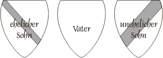 Bei all diesen Vorschriften wäre es ein Wunder, wenn nicht auch geregelt wäre, wie ein Wappen vererbt wird. Der älteste Sohn übernimmt das Wappen so wie es sein Vater getragen hat und gibt es in unveränderter Form an seine Nachkommen weiter. Die jüngeren Söhne dürfen zu ihren Lebzeiten ebenfalls das Wappen ihres Vaters führen. Es wird allerdings mit einem dünnen Schräglinksbalken in kontrastierender Farbe als Wappen eines jüngeren Sohnes gekennzeichnet. Bei unehelichen Söhnen, die von ihrem Vater anerkannt wurden, ist die Regelung ganz ähnlich, nur führen sie einen breiteren Schrägrechtsbalken als Wappenminderung. Töchter führen das ererbte Wappen unverändert und behalten es auch in der Ehe mit einem wappentragenden Mann. Ob jüngerer Sohn, Bastard oder Tochter - keiner von ihnen kann sein Wappen an seine Nachkommen weitergeben. Die einzige Ausnahme hierbei ist eine Erbtochter, deren Mann kein Wappen vererben kann. Sie und nur sie kann mit königlicher Zustimmung ihr Wappen weitergeben.