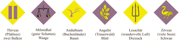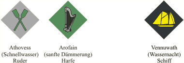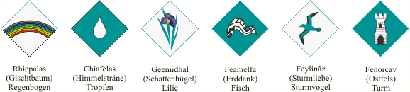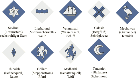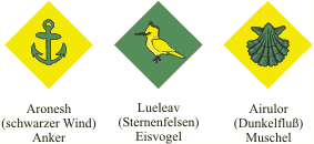 Da ich gezwungen war, auf bereits bestehende Wappenbilder zurückzugreifen, sind die Wappen der Aleandon nicht ganz stilecht. Besonders der Drache der Echarasen und das Seepferd der Jawelea sind wohl kaum von der Gestalt, wie sie ein Künstler der Aleandon zeichnen würde.