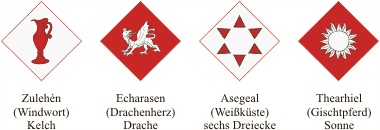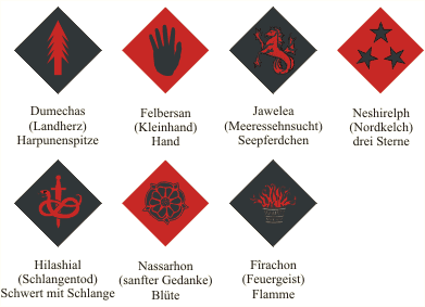 Wenden wir uns nun den Völkern zu, die unserem Verständnis ferner liegen. Keiner der nomadischen Stämme, weder die welschen Völker der südlichen noch die Ishia der nördlichen Ebenen, verwenden Symbole, denen man den Charakter eines Wappens zusprechen könnte. Doch sowohl die Mai San und die Völer Dhaharrans im Westen Apaconors, als auch die Aleandon in Diconor, kennen ein entsprechendes System. Doch wie es bei so fremden Völkern nicht verwundern darf, unterschieden sich diese Wappen stark von den unseren.
