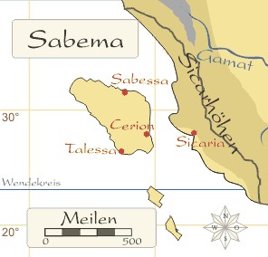 Einstmals um ein Vielfaches größer, beschränkt sich das Gebiet Sabemas heute nur noch auf die eigentliche Insel Sabema, sowie die gegenüberliegende Küste Apaconors, wo sich jedoch kaum mehr als einige Fischerdörfer befinden. Es ist ein von der Sonne durchglühtes Land, und nur wenige Wälder spenden Schatten. Überall ist das Wirken der Menschen spürbar, ja, das ganze Land scheint von der Historie geradezu durchdrungen. Einige der reichsten Städte Aurhims liegen hier, geziert von Tempeln, Palästen und anderen ruhmreichen Denkmälern.