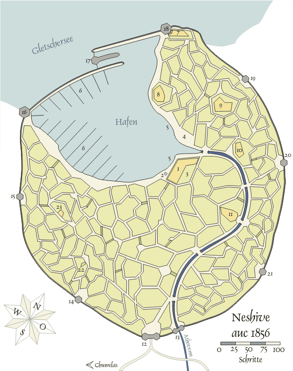 Jenseits des Athovenn lag der Festplatz Neshives (4). Vor dem Festplatz, wie auch direkt vor dem Palast lagen die Ankerplätze (5) für die wenigen großen Schiffe, die das kostbare Eisen aus den Dörfern in die Stadt brachten. Fremde Schiffe fanden niemals den Weg in diesen Hafen, denn Neshive ist als einzige Stadt der Aleandon nicht vom Meer zu erreichen, nicht einmal mit kleinen Booten. Viel zahlreicher waren deswegen die kleineren Boote der Fischer und die Yachten der Adligen, die ihre Liegeplätze (6) westlich des Palasts hatten.