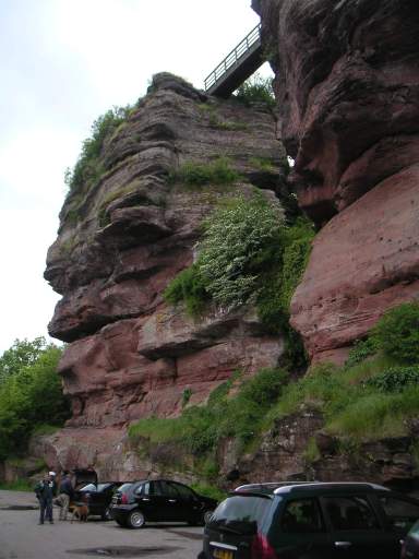 Blick vom Parkplatz (= Vorplatz) auf die beiden Felsen von Haut-Barr. Die Kluft reicht hier nur etwa bis zum Parkplatz hinab und durchschneidet nicht den Felsrücken selbst. Dafür sind die Felsen mit etwa 15m anderthalbmal so hoch wie die Felsen von Hohenhard.