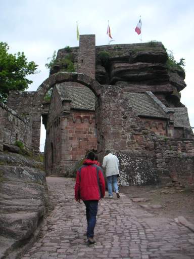 Das innere Tor sowie dahinter die Kapelle von Haut-Barr. Haut-Barr hat - anders als Hohenhard - nicht zwei Felsen, sondern drei. Zwei davon liegen direkt beieinander (im letzten Bild zu sehen), der dritte, den man hier sieht, etwas weiter vorne auf dem Sporn. In Hohenhard entspräche das in etwa dem Blick durch das innere Tor, nur daß dieses stärker befestigt ist, und zur rechten davon nicht die Kapelle, sondern der Kuhstall steht.