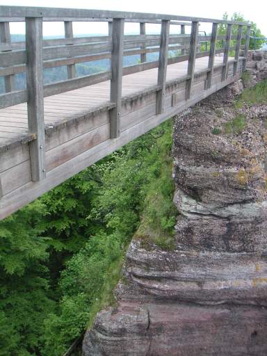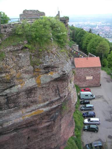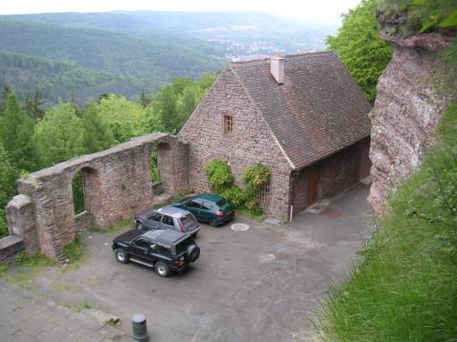 Blick vom einzelnen Felsen von Haut-Barr auf den Burghof und das darunterliegende Tal. In diesem Bild wird die beherrschende Lage dieses Felsvorsprungs sehr schön deutlich. Man kann auch gut erkennen, warum die Mauer, die den Burghof auf dieser Seite abschließt, nicht befestigt sein muß. Das Tal ist soweit unterhalb, daß ein Angriff hier unmöglich ist.