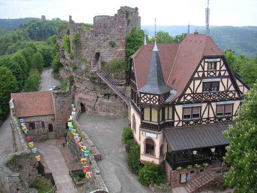 Haut-Barr (oder Hohbarr) ist eine Burg, die ursprünglich von den Staufern erbaut wurde. Hoch über der Stadt Saverne (= Zabern oder "Tres Tabernae") gelegen, hat sie eine so beherrschende Lage, daß sie auch das "Auge des Elsaß" genannt wird. Mich hat sie so beeindruckt, daß ich Burg Hohenhard nach ihrem Vorbild entworfen habe. Aber ein bißchen anders ist es dann schon.