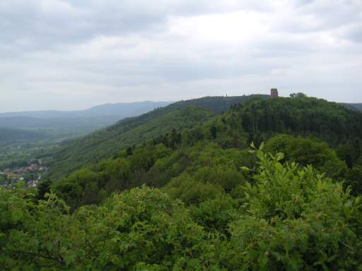Blick vom einzelnen Felsen zurück auf die beiden anderen. Haut-Barr ist leider nur noch eine Ruine.