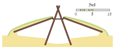 Schematische Zeichnung eines Winterhaus, wie es von den Rotfelsen erbaut wird. Das Dach wird von Holzstangen getragen, die in der Art eines Zeltes zusammengebunden sind. Von diesen gehen weitere Holzstangen nach außen, wo sie von einem Erdwall gehalten werden. Die Erde für diesen Wall stammt aus dem Inneren des Hauses, wo sich eine leicht abfallende Fläche, die vor allem als Schlafplatz dient, um eine tiefer gelegene Mitte zieht. In dieser Vertiefung in der Mitte befindet sich die Feuerstelle. Über die Holzstangen des Daches werden geflochtene Matten und Zweige gebreitet, bevor das Dach mit einer Schicht Erde und den ausgehobenen Grassoden abgeschlossen wird. Nur über der Feuerstelle bleibt eine Öffnung, die bei schlechtem Wetter mit einem ledernen Lappen verschlossen werden kann. |